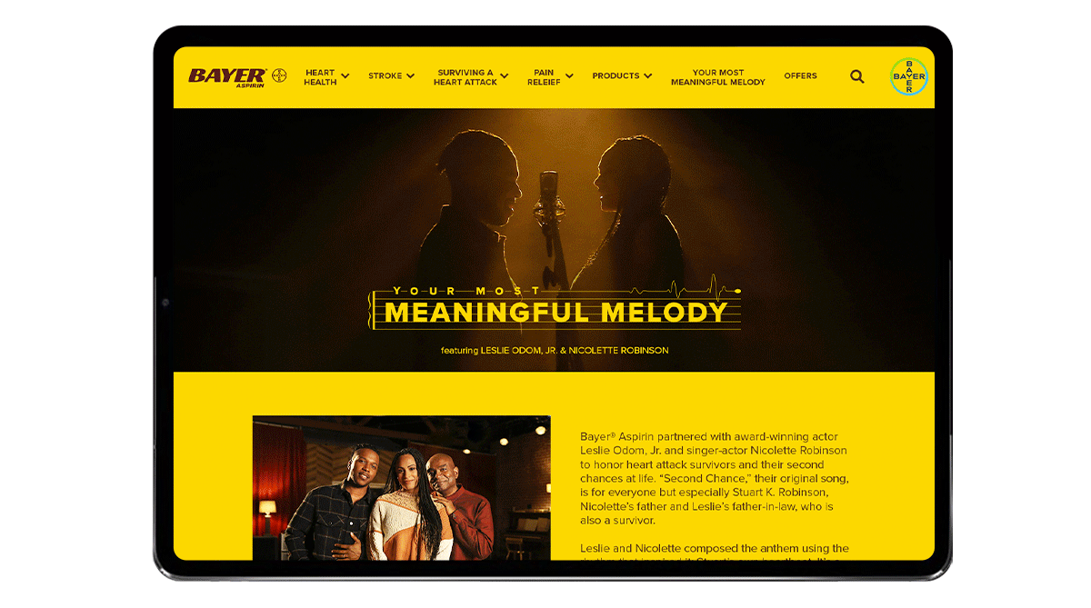 After a heart attack, survivors emerge not only with a second chance at life, but also a unique, new heart beat. Inspired by the discovery of this fact and a challenge to forge a deeper connection with our consumers and their loved ones, we set out to create an anthem that celebrates a second chance at life by using a survivor’s real heart beat as the rhythm. We partnered with Leslie Odom, Jr. who composed an original soundtrack using his father-in-law, Stu’s real heart beat then captured the emotions as Leslie and his wife, Nicolette, performed the song for the first time to Stu.